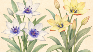 原種チューリップ「アルバ・コエルレア・オクラータ」と「アニカ」の球根の植え付け、発芽、開花、掘り起こしまでを記録しています。